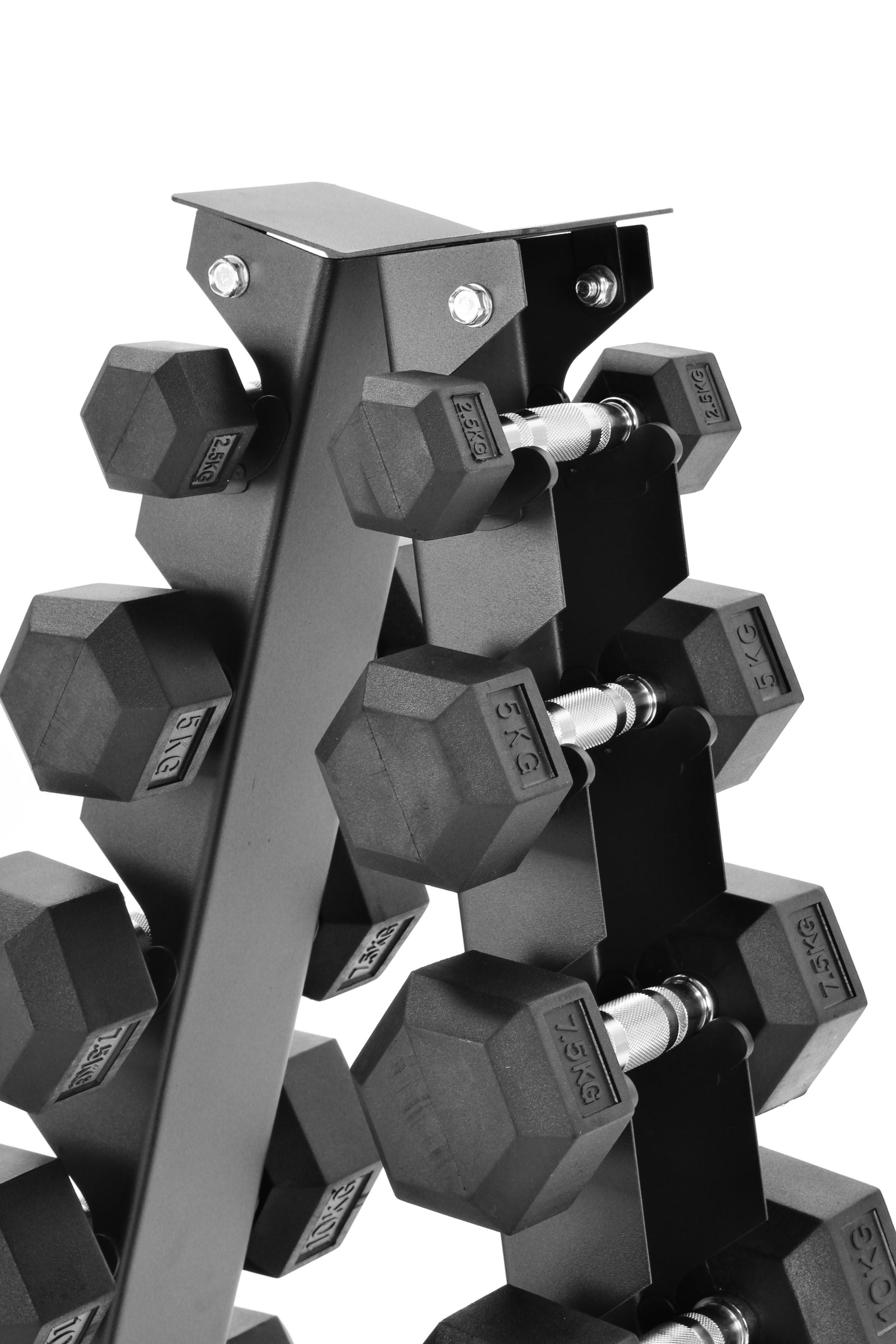 This set contains 2.5kg to 15kg pairs with the ‘A’ shape rack included. The pairs included are 2.5kg, 5kg, 7.5kg, 10kg, 12.5kg & 15kg Pairs